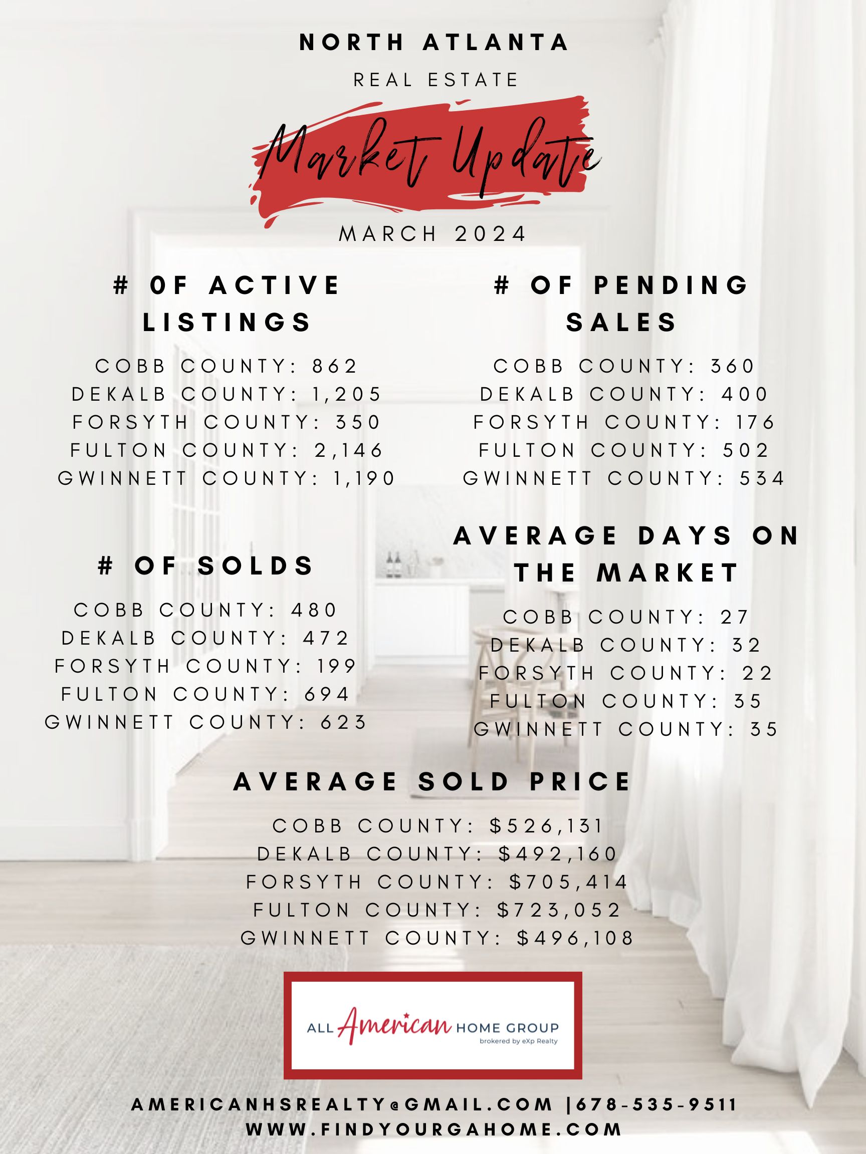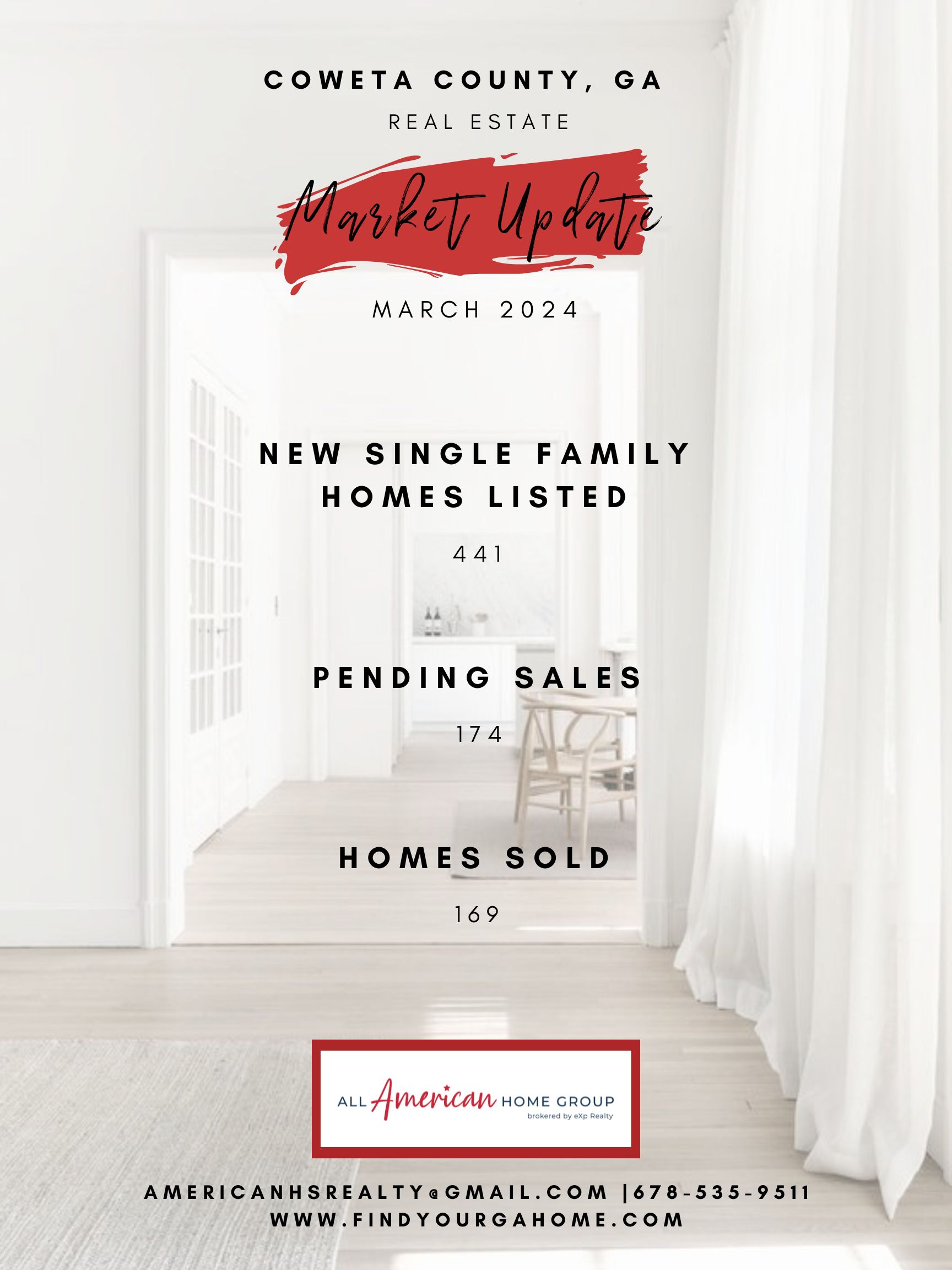 The number of homes that sold in Coweta County in March is down some from the year before. Some of that could be from having less inventory in previous months than we saw in 2023. One trend that continued was that the average sold price continued to increase some from 2023. The average day on the market was about the same as it was this time last year.
