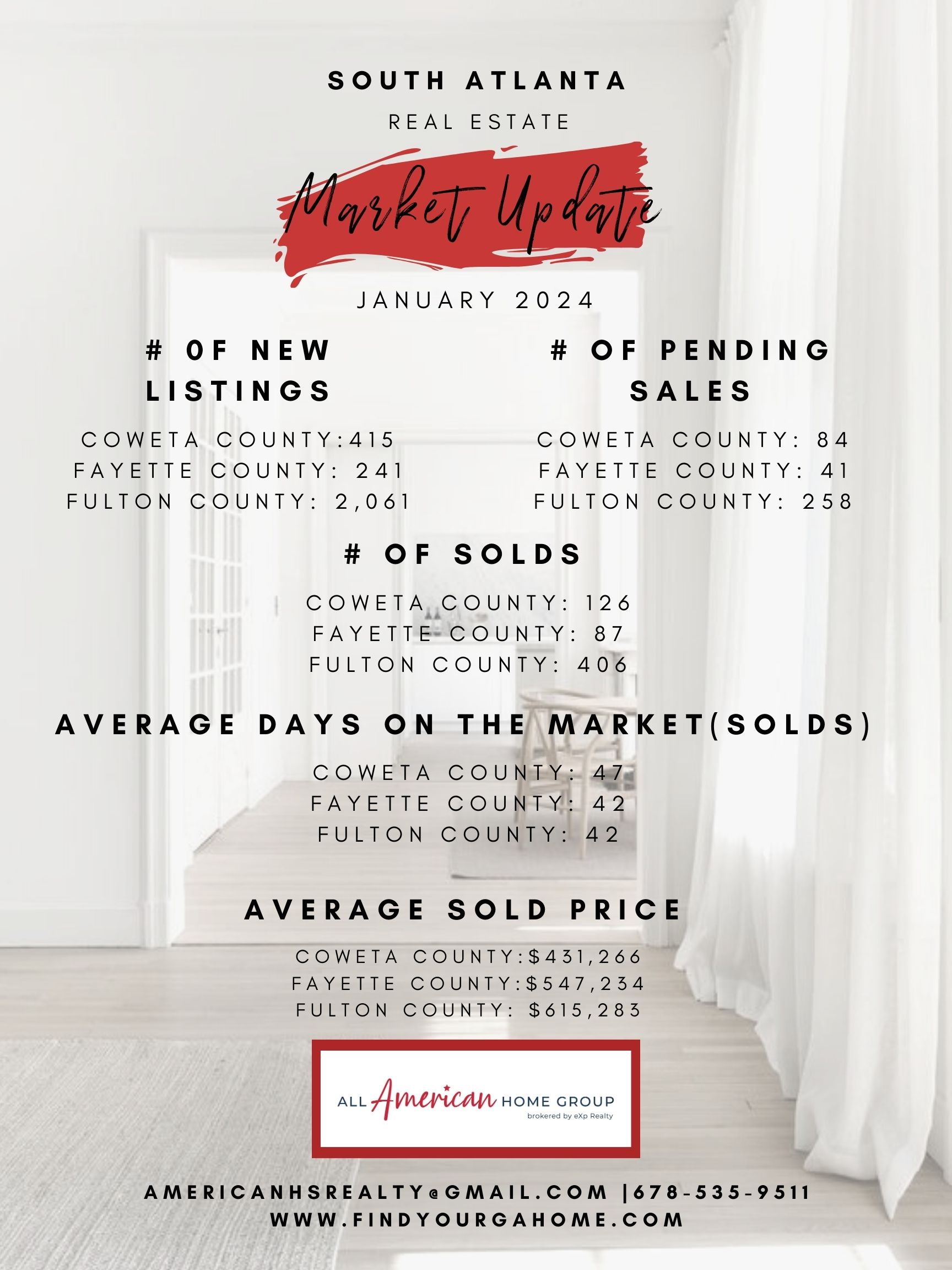 The number of homes that sold in Coweta County in January is down about 11% from the year before. One trend that continued was that the average sold price continued to increase from 2023. The average day on the market was higher then it was this time last year.