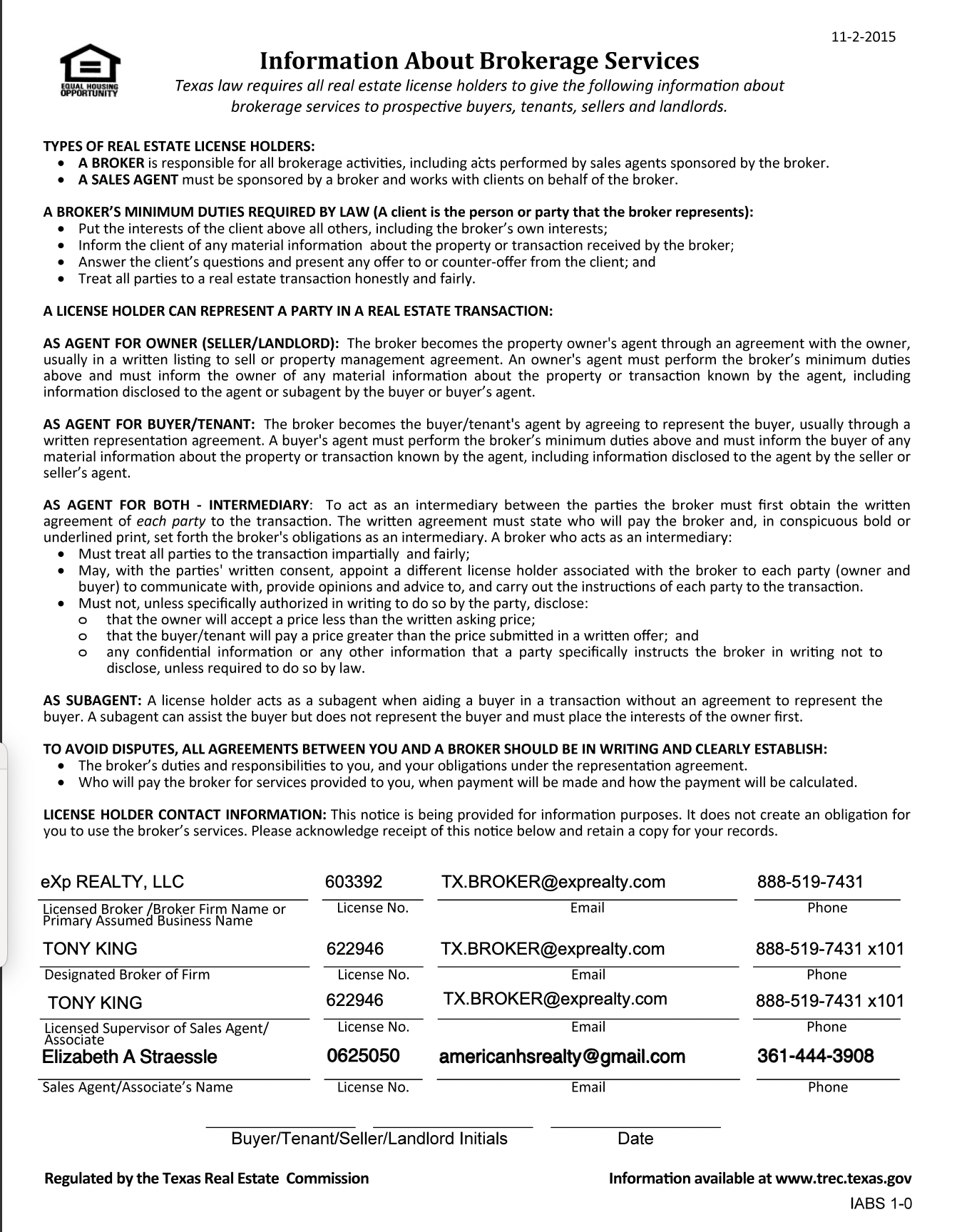 Texas Real Estate Commission Information About Brokerage Service
